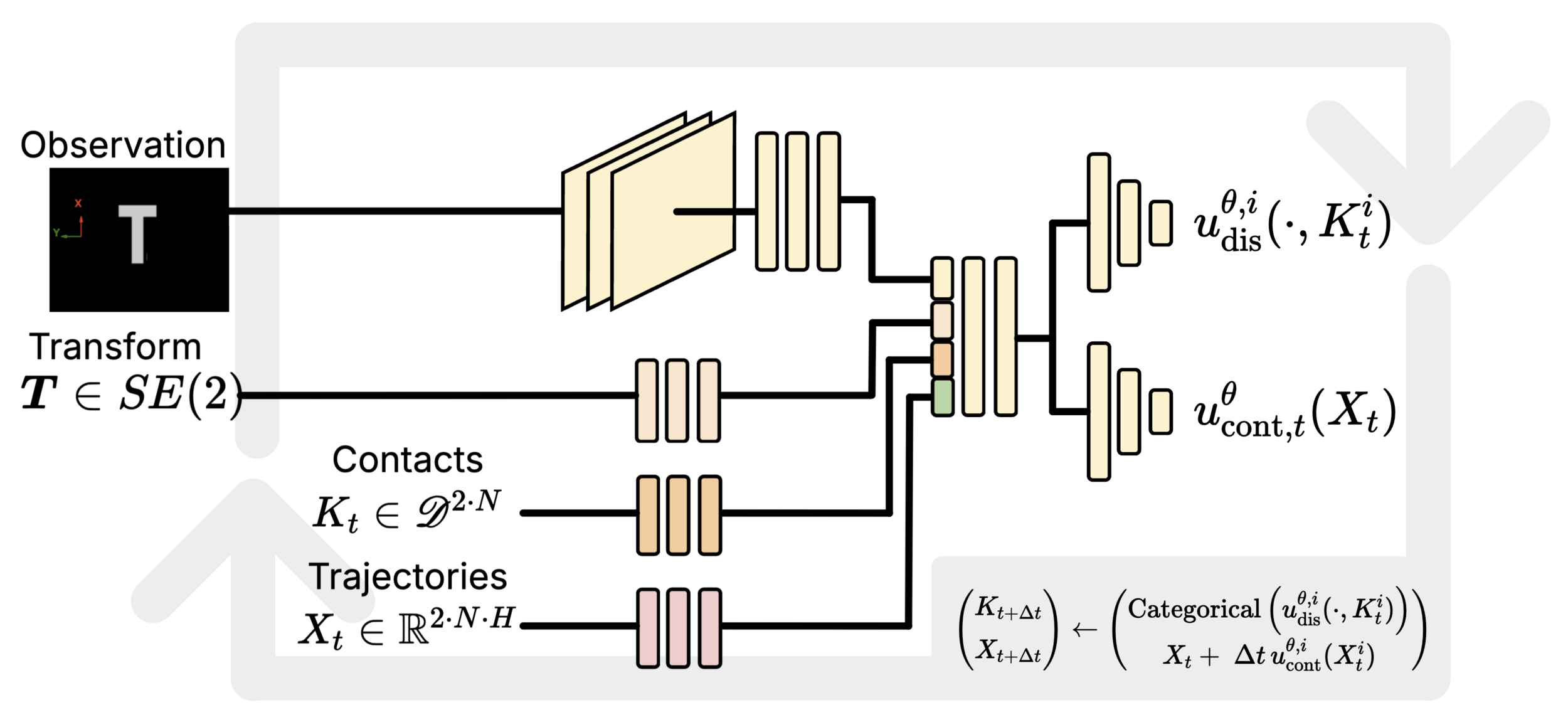 Learn two velocity fields, \(u^{\theta}_{\mathcal{K},t}( ^t\mathcal{K})\) and \(u^{\theta}_{\mathcal{T},t}( ^t\mathcal{T})\), and concurrently generate both contact points and manipulation trajectories: