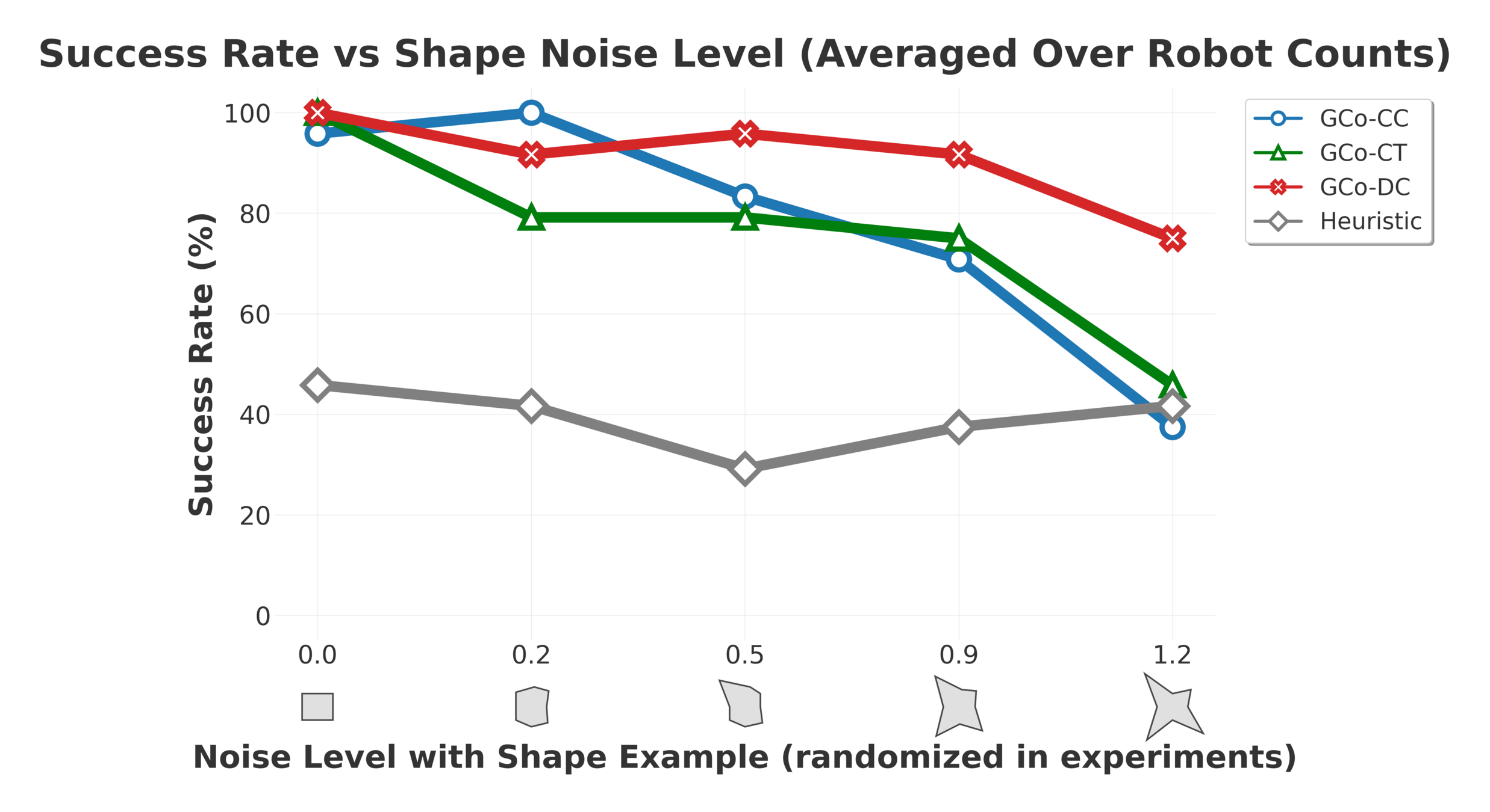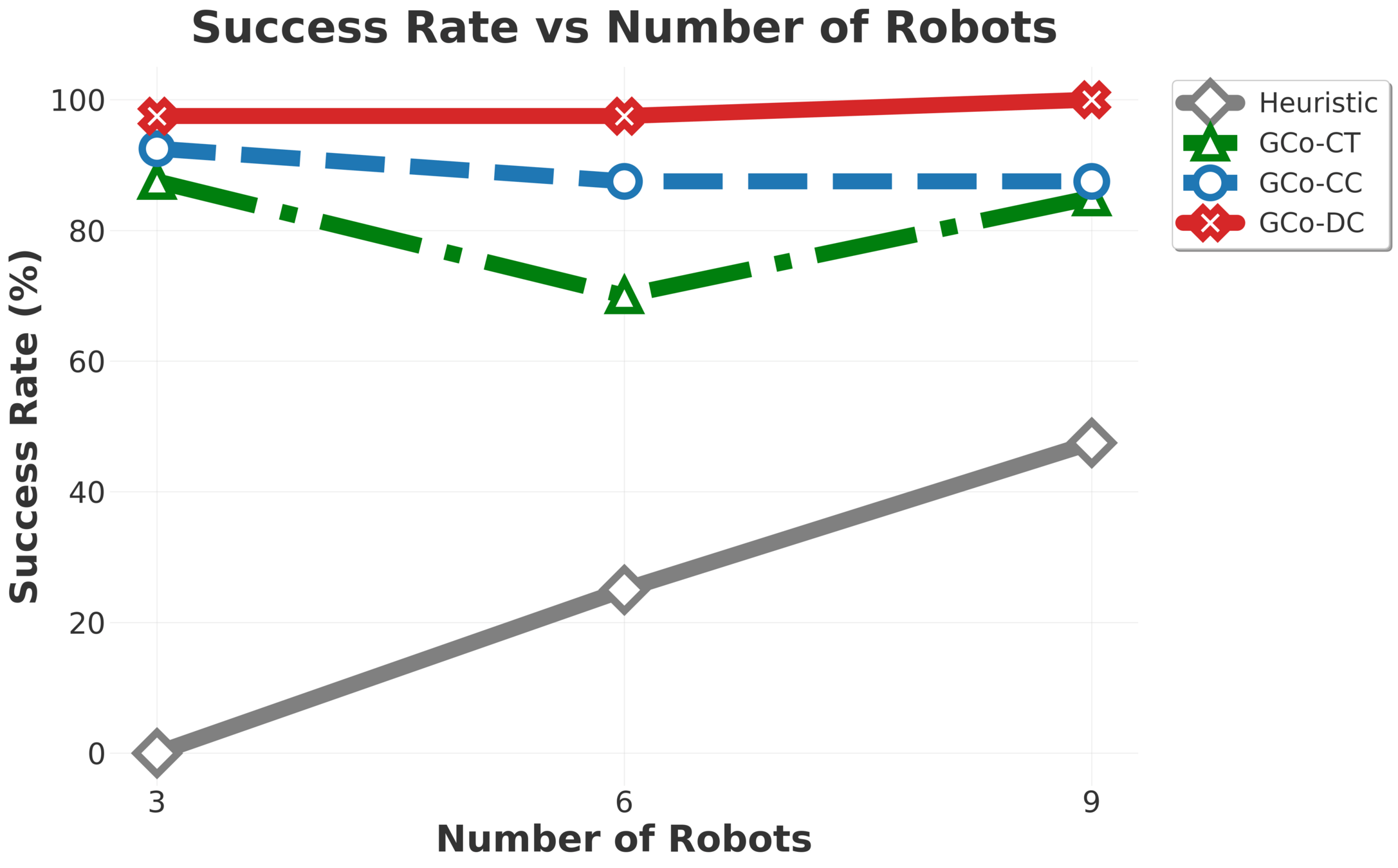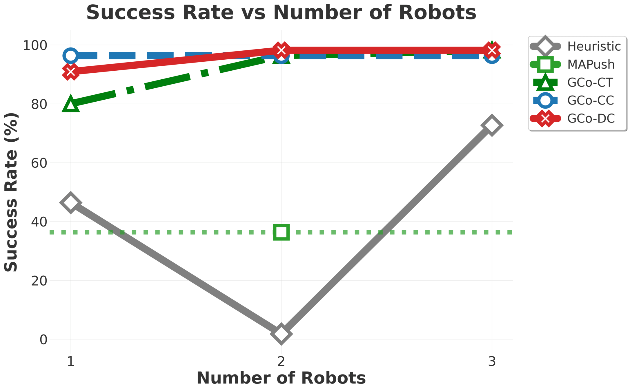 \(\text{GC}\scriptsize{\text{O}}\) composes per-object models, scaling to nine robots and five objects, including cases where objects outnumber robots.