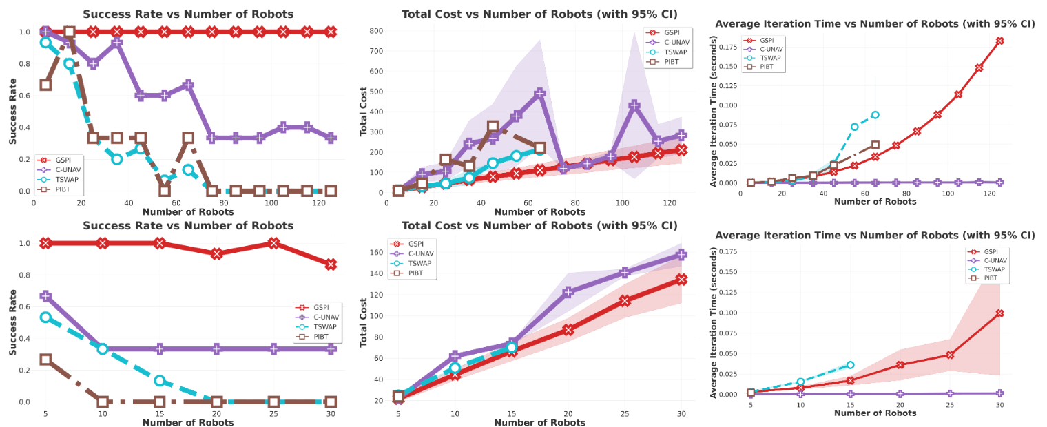 \(\text{{G\scriptsize SPI}}\) is efficient and scales to 300 robots in our experiments.